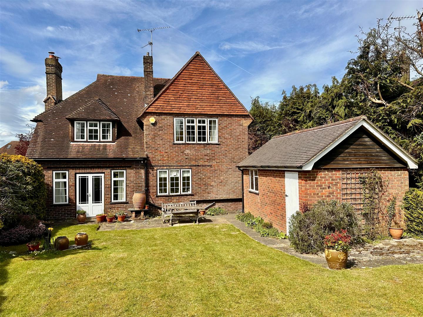 A 4 bedroom detached family house with 2 reception rooms, 2 bathrooms and a large kitchen/dining room situated on a private road no through road. Farthings enjoys a lovely garden of about 0.7 acre with a useful detached studio with attached store, shed and carport and driveway parking. Planning permission was granted in September and October 2022 to convert the studio into a 2 bedroom self contained annexe and extending the house to create a 5 bedroom house.